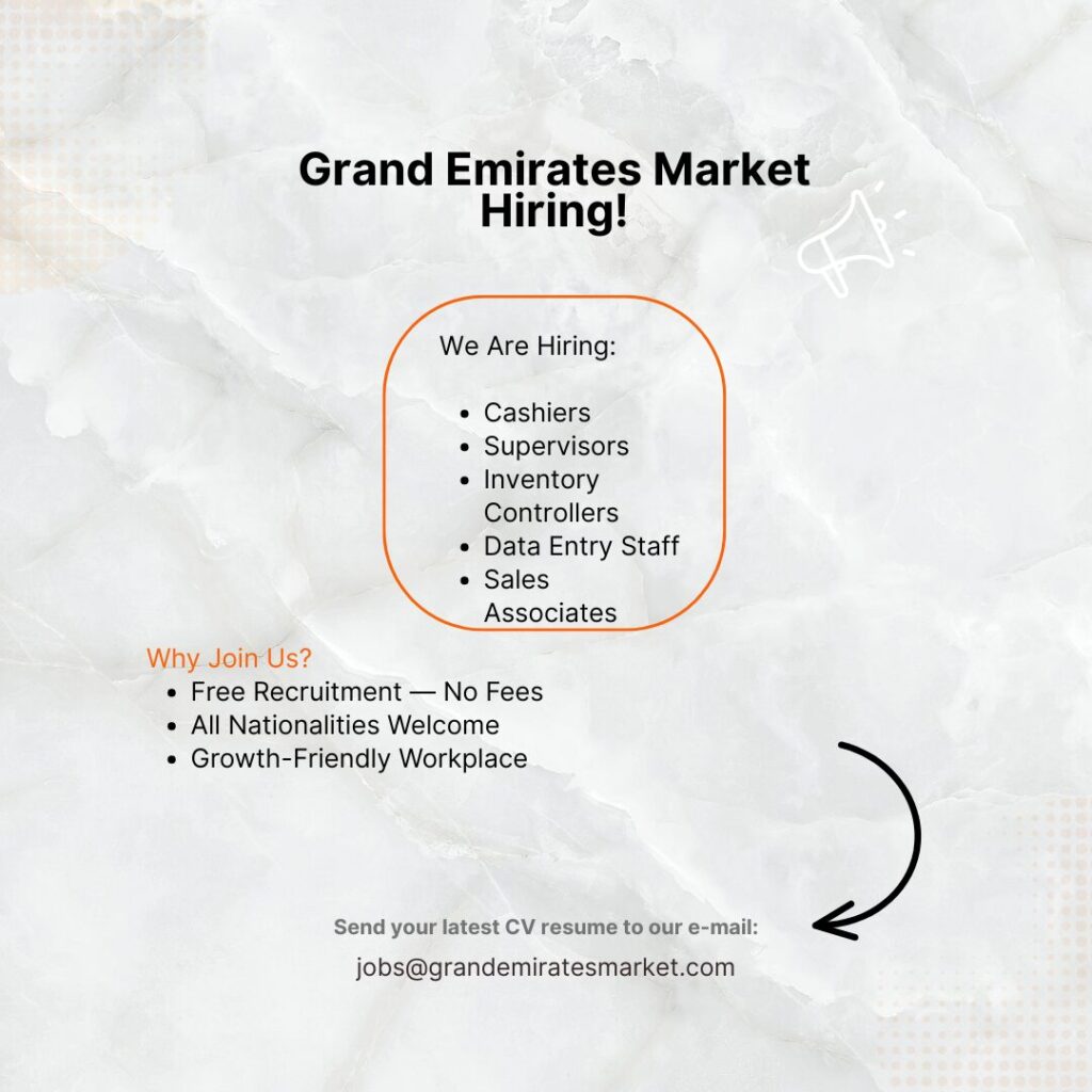 The Grand Emirates Market is announcing a broad recruitment drive across the United Arab Emirates for 2025, opening multiple career pathways for skilled professionals and motivated newcomers. Recognised for its customer-first retail approach, Grand Emirates Market is expanding operations in Abu Dhabi and seeks candidates who are eager to grow within a reputable, fast-paced organisation.